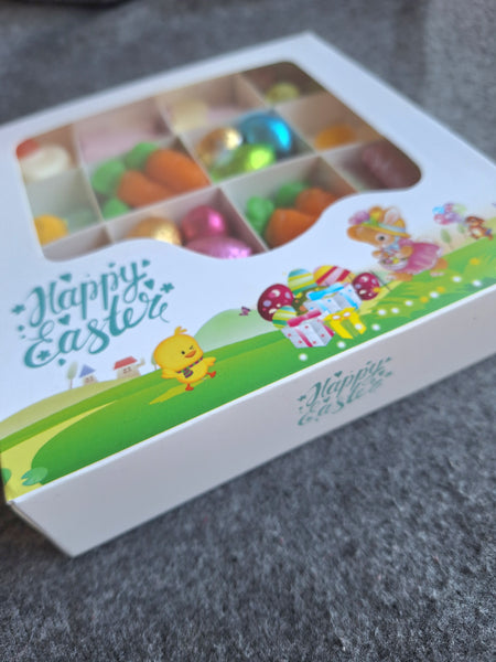 16 sections of colourful confectionery which includes: Fried eggs, mini eggs, flower marshmallows, Jelly fruit carrots, Milk chocolate in coloured foil, watermelon sweets & Easter themed marshmallows.