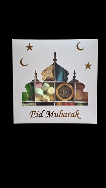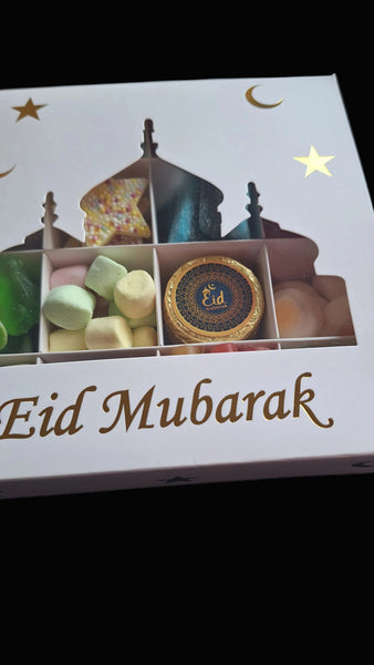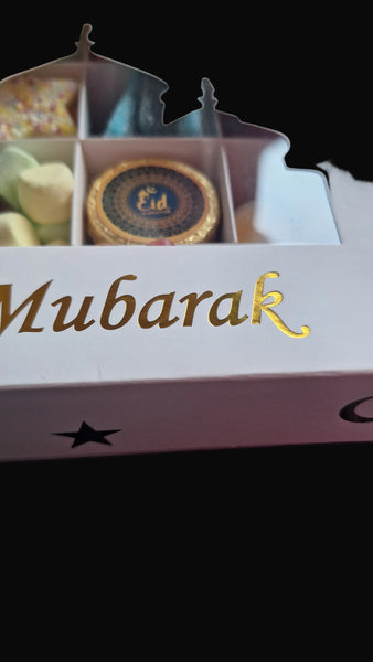 Comes beautifully presented in a white box with shiny gold Cresent & Stars patterns and reads 'Eid Mubarak' in gold.