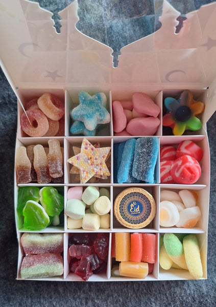 16 generous sections which include the following:- Fererro Rocher, Strawberry mushrooms, Blue raspberry bottles, foam mushrooms, Strawberry twists, mini Blue raspberry pencils, watermelon slices & milk chocolate crisps chocolate.